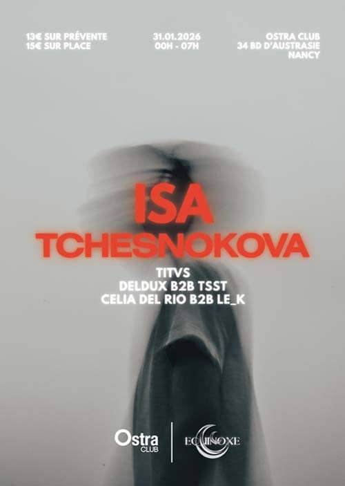 Pour notre toute première soirée à l’𝙊𝙨𝙩𝙧𝙖 𝘾𝙡𝙪𝙗, temple emblématique de la techno Nancéienne, nous invitons : 𝐈𝐒𝐀 𝐓𝐂𝐇𝐄𝐒𝐍𝐎𝐊𝐎𝐕𝐀.