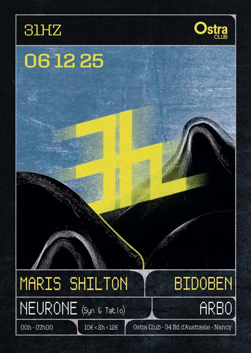 SAM 6 DEC 2025 | 31 HZ invites MARIS SHILTON x BIDOBEN x NEURONE (Syn & Tatlo) x ARBO | Techno buy tickets Venue: OSTRA CLUB Location: NANCY, FRANCE Date: Déc 06 to Déc 07 Length: 23:55 – 7:00 SAM 6 DEC 2025 Prod 31 HZ Techno